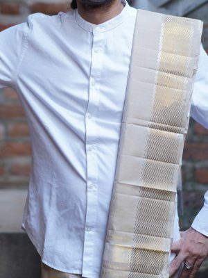 This is a handwoven silk dhoti feauture a shade of light brown with self border detailed in pure gold and silver zari
