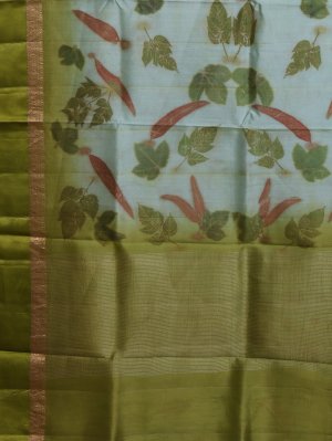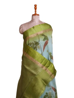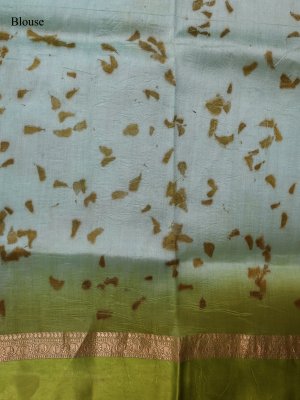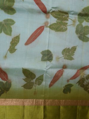 Light Cyan Eco Print Tussar Silk Saree with Mehendi Green Satin Border