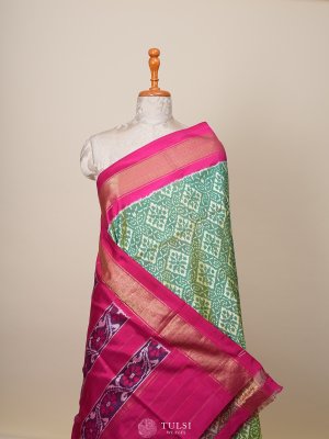 This exquisite Light Green Ikat Silk Saree showcases mesmerizing geometrical patterns meticulously woven into the fabric, emanating a sense of traditional artistry. Paired with a vibrant pink border, this saree seamlessly marries bold design with subtle elegance