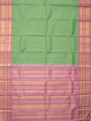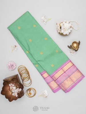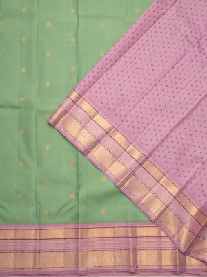 The Light Green Kanchipuram Silk Saree features elegant buttas on the body, beautifully complemented by a lilac border. This harmonious blend of colors and intricate detailing makes it perfect for any special occasion.