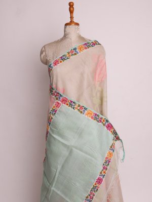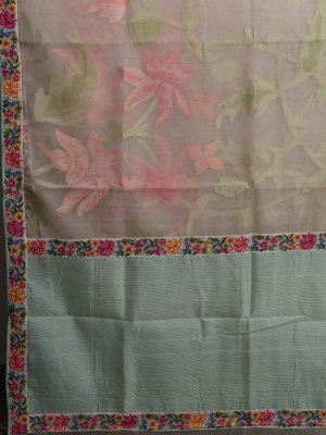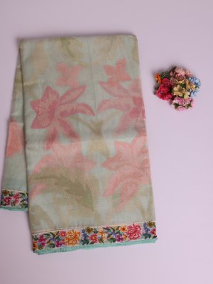 A light green Kora Jamdani silk saree featuring a petite point-embroidered small border adorned with delicate floral motifs. The embroidery showcases vibrant shades of red, orange, parrot green, blue-madhi green, sky blue, yellow, green, and rose, creating a subtle yet lively contrast against the soft green base. Simple, elegant, and timeless, this saree blends traditional Jamdani craftsmanship with understated sophistication, perfect for festive, formal, or special occasions.