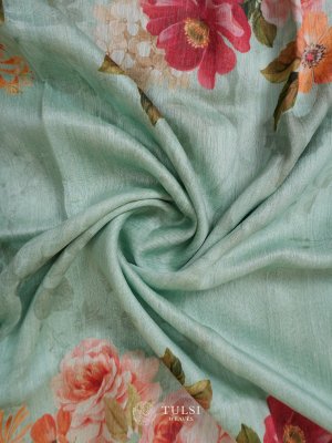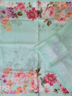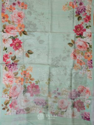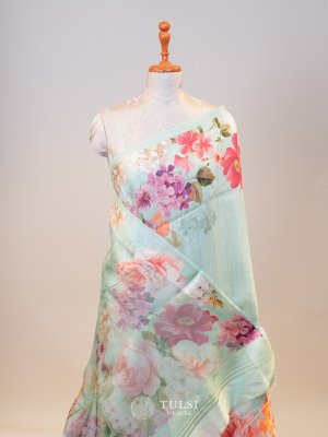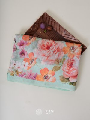 This Light Green floral-printed linen saree is ideal for any special event. Crafted from soft linen, it drapes gracefully and offers a comfortable fit. The lively floral designs bring a hint of nature's charm.