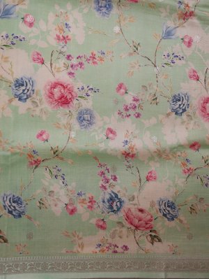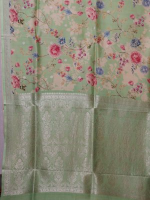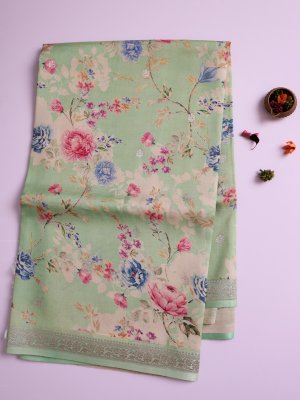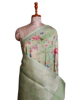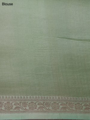 This light green tussar georgette silk saree features an elegant all-over floral printed body in soft pastel hues. The saree is beautifully complemented by a rich zari-woven border that adds a touch of traditional charm. The pallu is adorned with intricate zari work, enhancing its festive appeal. A perfect blend of subtle grace and timeless sophistication.