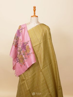 Elevate your style with this elegant Light Green Tussar Silk Saree, featuring intricate hand-embroidered Kantha work. The soft texture and natural sheen of Tussar silk blend beautifully with traditional motifs inspired by nature. Perfect for festive and cultural occasions, it brings timeless charm to any wardrobe.