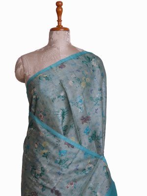 Blue Printed Tussar Silk Saree