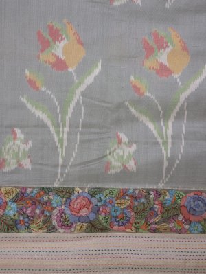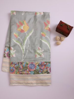 This Light Grey Patola Silk saree features a sophisticated grey body adorned with yellow and red floral motifs and delicate green foliage. The elegant off-white border showcases intricate shadow embroidery of flowers and leaves, transitioning into a grand handcrafted pallu. The pallu is finished with a stunning combination of dense shadow embroidered work and traditional horizontal stripes of kantha embroidery for a rich, artisanal look.
