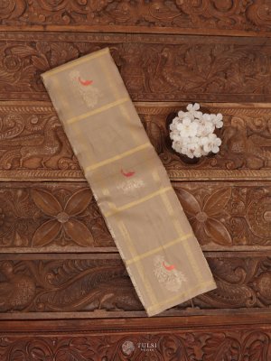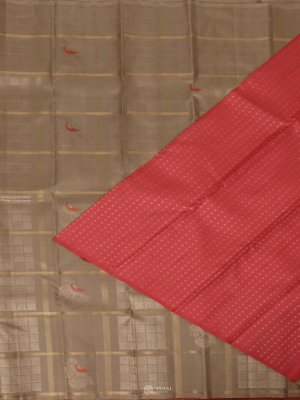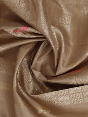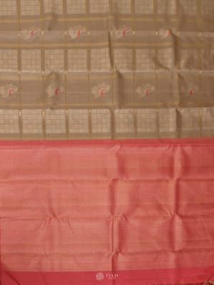 This Light Khaki Kanjeevaram Silk Saree features an elegant and understated design, perfect for those who love subtle traditional beauty. The khaki body is woven with gold-checked patterns and highlighted with delicate motifs that add a refined touch to the soft silk texture. The contrasting coral pink pallu introduces a gentle pop of color, enriched with intricate zari weaving that enhances the saree’s classic charm.