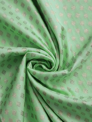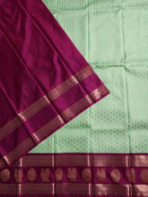 This Light Rexona Green Kanjeevaram Silk Pavadai features a luminous body adorned with delicate golden Butta clusters that shimmer. The striking Dark Magenta border is intricately woven with majestic Annapakshi and circular Butta patterns, offering a rich contrast that defines timeless Indian craftsmanship. Paired with a matching Dark Magenta blouse piece, this ensemble exudes grace and heritage, perfect for celebrating special milestones and festive occasions.