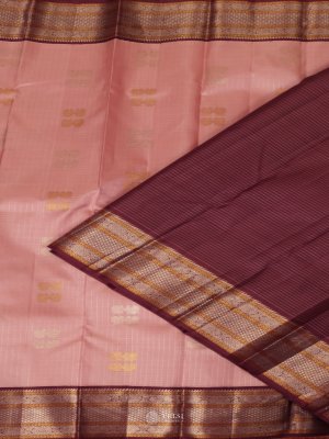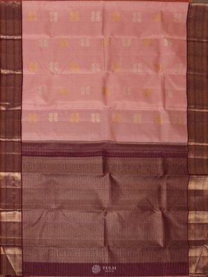 This Light Mauve Pink Kanjeevaram Silk Saree is a vibrant blend of tradition and elegance. The rich burgundy pallu and lower half showcase classic Kanjeevaram weaving with lustrous gold zari detailing, giving the saree a radiant festive appeal. The contrasting pink body features subtle woven lines and tiny buttas that add refined texture without overpowering the look. Together, the bright dual tones create a striking yet graceful harmony.