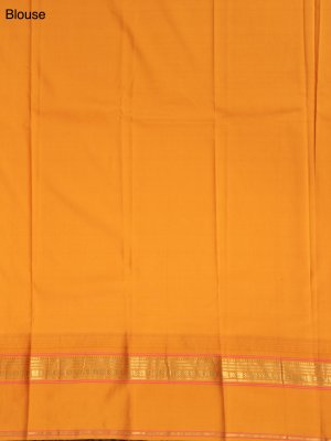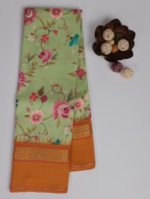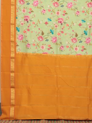 This light parrot green Kanjeevaram silk saree, featuring a luxurious mustard orange border with golden zari and a rose seer pattupettu edge, offers a soft, comfortable drape perfect for all-day wear. The saree is adorned with a vibrant allover floral print in off-white, pink, red, black, green, and orange, adding a lively, elegant charm to its timeless silk richness.