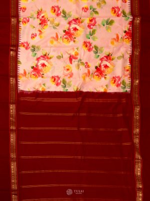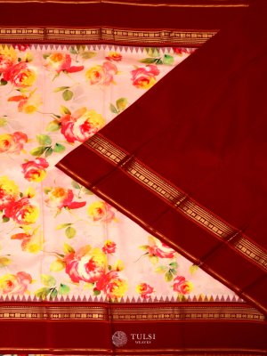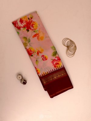 This Light Pastel Pink Printed Kanjeevaram Silk Saree beautifully blends vibrant charm with traditional craftsmanship. The bright pink body is adorned with elegant floral prints, adding a fresh, artistic touch to the rich silk base. Complementing the lively design is a deep maroon border woven with intricate gold zari, bringing a classic Kanjeevaram grandeur to the ensemble. The pallu features matching maroon tones with subtle gold detailing, creating a harmonious and timeless finish.
