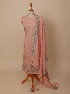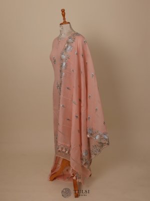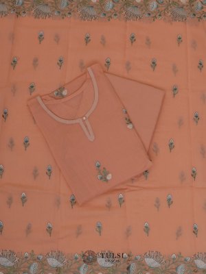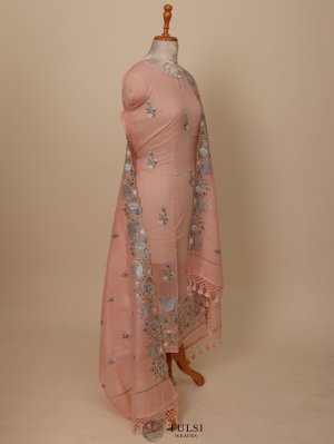 This Light Peach Chanderi Salwar Material features a soft, lightweight fabric with a graceful floral design. Its subtle sheen and elegant texture make it perfect for both festive and everyday wear.