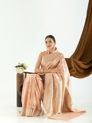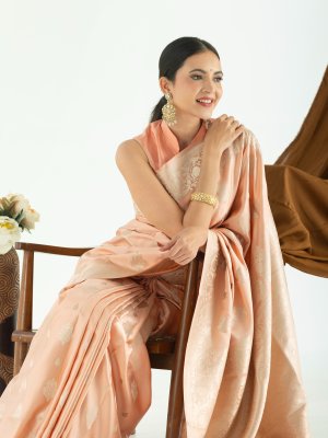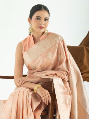 This Light Peach Mashru silk saree features zari butties throughout the body. The saree is beautifully framed with a self-zari border, offering a perfect blend of tradition makes perfect choice for weddings and special occasions
