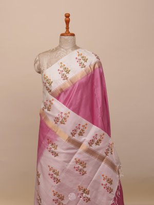 This Light Pink Soft Silk Saree features a lustrous Pink body paired with beautifully block-printed details on both the pallu and border. The intricate floral prints in shades of dark pink and yellow add a refined traditional charm. Lightweight and smooth in texture.
