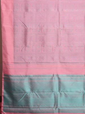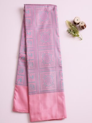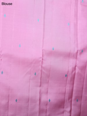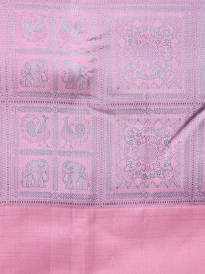 This light pink Kanchipuram silk saree combines comfort and elegance with its soft, easy-to-drape silk. Inspired by Orissa Bomkai designs, it features intricate elephant and peacock motifs in the thread work. The pallu’s sky-blue highlights create a vibrant, refreshing contrast. Perfect for festive occasions, this saree blends traditional artistry with modern wearability.