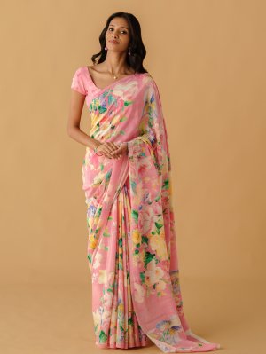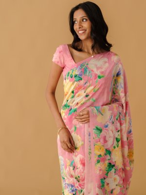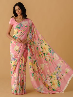 This exquisite light pink crepe silk saree features a delicate floral print in shades of blue, green, yellow, light green, and deep pink, creating a harmonious and vibrant look. The soft crepe silk drapes elegantly, adding a touch of sophistication to any occasion. Its subtle yet colorful floral motifs bring a refreshing charm, perfect for daytime or festive events. Lightweight and graceful, it combines traditional elegance with contemporary style. Ideal for those who love understated beauty with a pop of color.