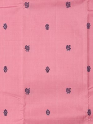 A delicate light pink Kanjeevaram pattu silk saree, featuring elegant grey mayil chakram motifs across the body. The creamy border and pallu are adorned with exquisite jada nagam and graceful peacock designs, adding a royal touch. A timeless piece, perfect for festive occasions and grand celebrations.