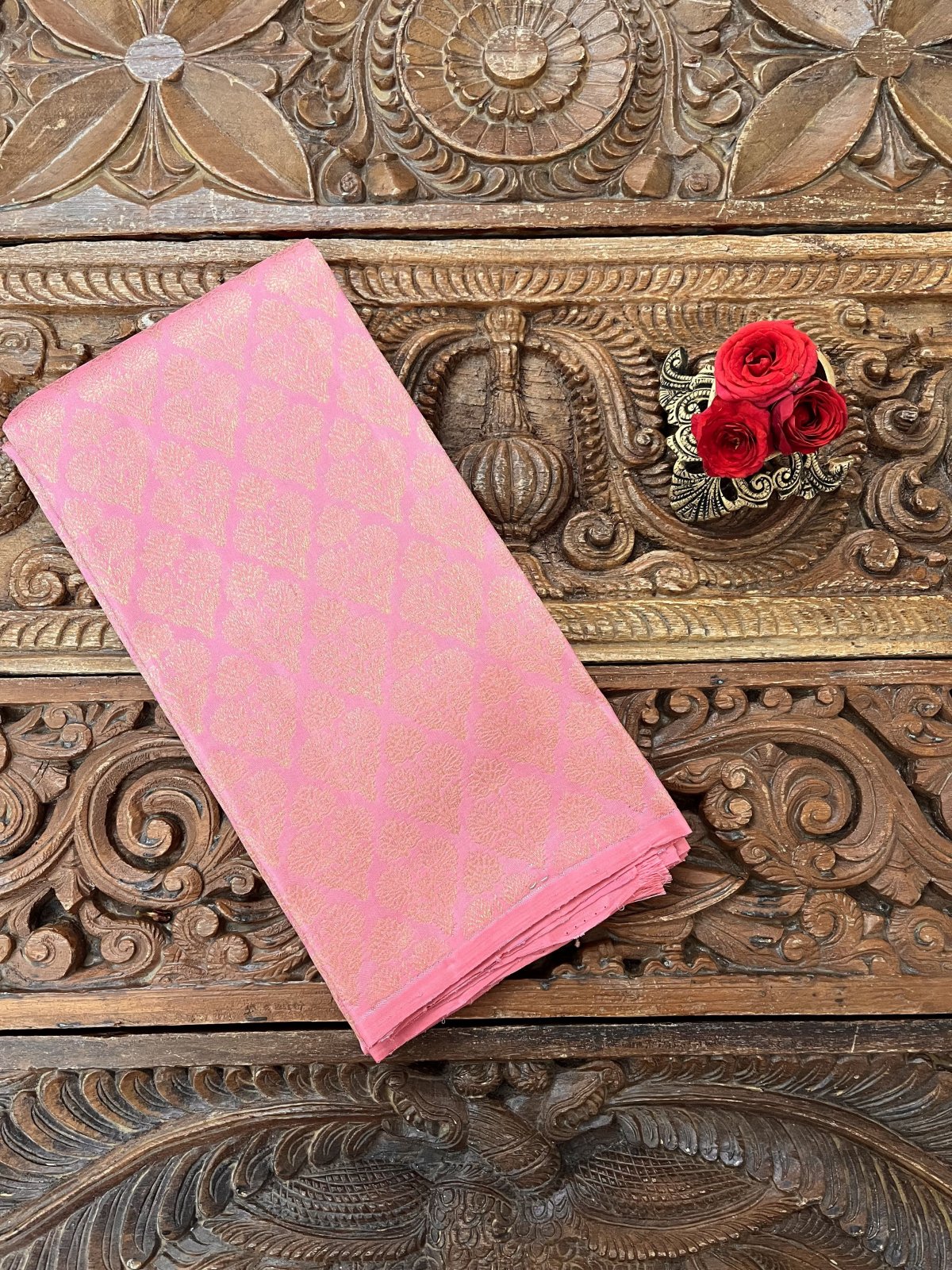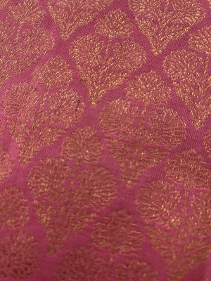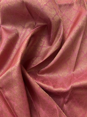 This handwoven light pink Kanjeevaram silk blouse is adorned with elaborate floral brocade in pure gold zari woven all over.