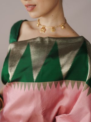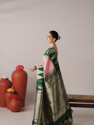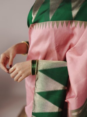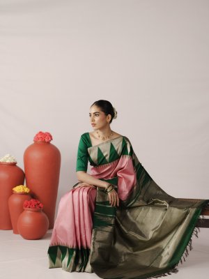 This beautiful Kanjeevaram silk saree features a soft light pink color on the main body, giving it a gentle and elegant look. It is paired with a bold emerald green border that stands out perfectly against the pink. The most striking detail is the gold zari work, which is woven into a checkered pattern on both the border and the end of the saree (the pallu).