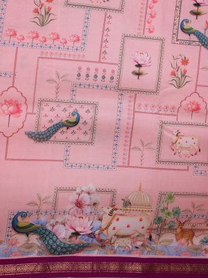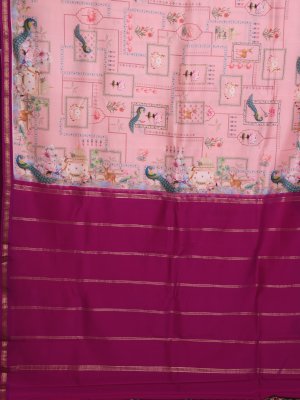 This light pink Kanjeevaram silk saree features delicate floral digital prints with elegant peacock and motif detailing, creating a unique and artistic appeal. The soft pastel base enhances its intricate design, blending contemporary charm with timeless grace. It is beautifully finished with a rich magenta zari border, adding a bold touch of sophistication—perfect for unforgettable celebrations and cherished memories.