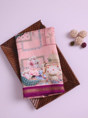 Light Pink Printed Kanjeevaram Silk Saree With Magenta Border