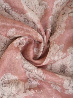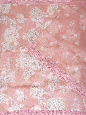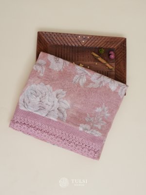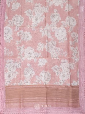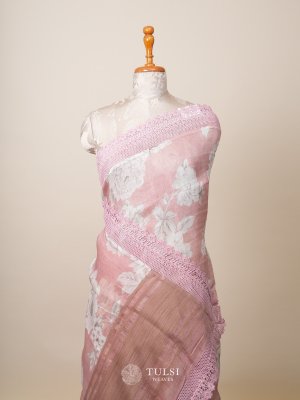 This Light Pink linen silk saree is adorned with a graceful floral print on the body and an elegant lace border. Its lightweight and airy fabric make it a perfect choice for any refined occasion.
