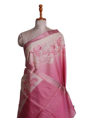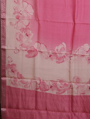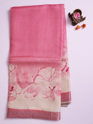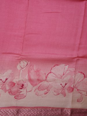 This light pink tussar silk saree features a soft pastel body complemented by elegant off-white side panels adorned with delicate floral borders. Zari work along both borders & pallu adds a subtle shimmer and richness. The overall look is graceful, making it suitable for both everyday wear and special occasions.