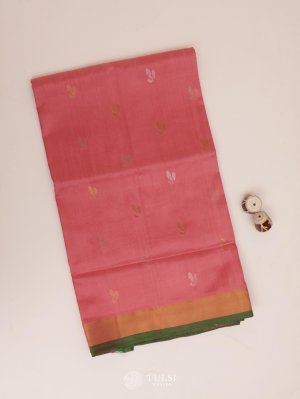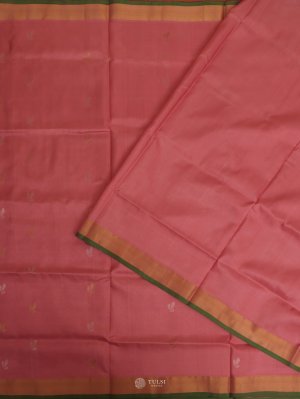 This Light Pink Uppada Silk Saree features beautiful floral butis on the body, paired with a delicate zari border, creating an elegant and refined look. The rich silk fabric adds a touch of grace and sophistication to any occasion.