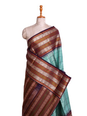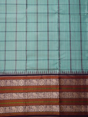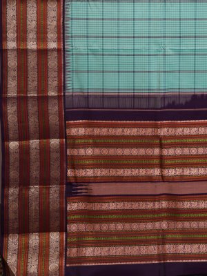 This Light Turquoise Kanjeevaram Silk saree exhibits a matte, structural elegance through its intricate body checks and substantial weave. The dark purple Pattu Pettu border and pallu showcase tactile copper-toned animal motifs including sacred elephants and annapakshi, finished with a classic temple-style interlocking edge. The heavy threadwork provides a rich, grounded drape and a traditional matte finish that feels smooth to the touch.