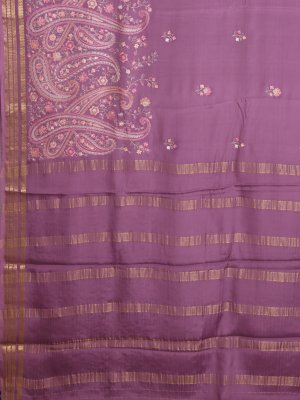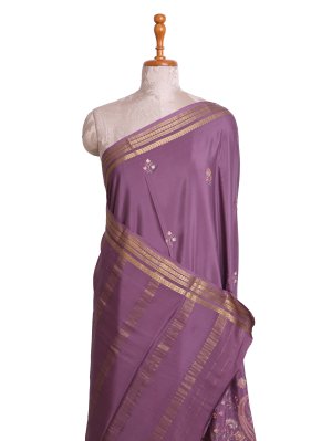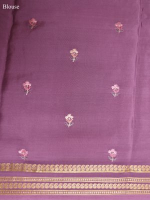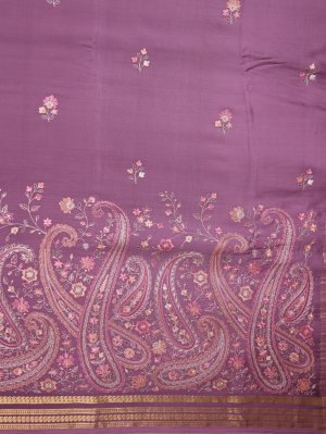 This Lilac Mysore Silk saree presents a weightless, pebble-textured drape adorned with intricate multi-colored floral embroidery and grand paisley motifs across the lower pleats. The borders are defined by gleaming gold zari bands and a row of miniature traditional mango patterns, leading into a pallu finished with dense horizontal metallic stripes. Every inch of the soft fabric is meticulously detailed with scattered floral buttas and a coordinated blouse piece featuring a decorative zari hem for a polished finish.