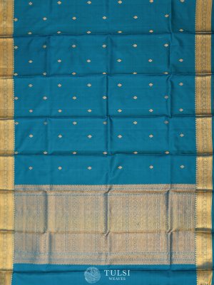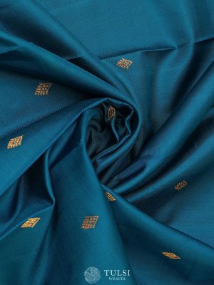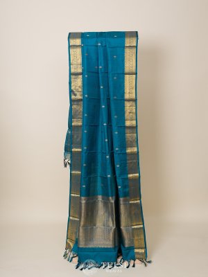 This exquisite Teal Blue Kanjeevaram silk dupatta is a celebration of traditional craftsmanship and timeless elegance. Adorned with a fine buttas that adds a touch of sophistication, it is further embellished with delicate kamalam buttis