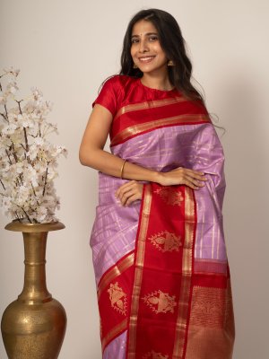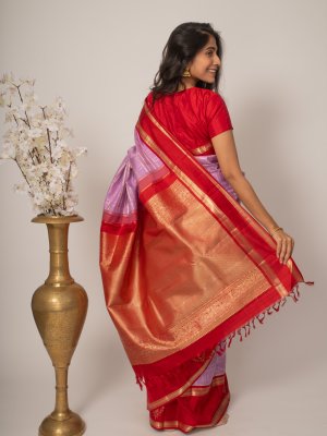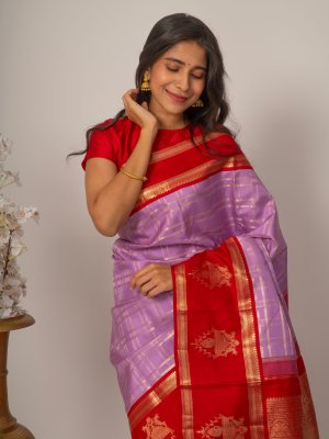 The Lilac Kanjeevaram Silk Saree radiates sophisticated charm with its vibrant red butte border. The body of the saree features intricate zari checks, adding a touch of regal elegance to its overall appearance. Perfect for any special occasion, this saree blends tradition with a modern flair.
