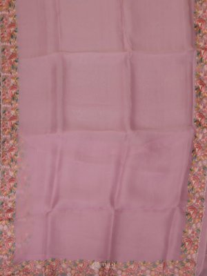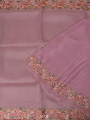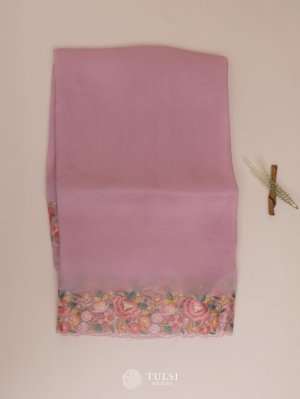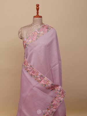 This Lilac Organza Saree features intricate floral embroidery along the borders, beautifully crafted in shades of pink, yellow, and green. The sheer organza fabric adds a graceful flow and lightweight elegance, while the detailed threadwork enhances its sophisticated charm.
