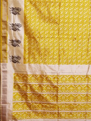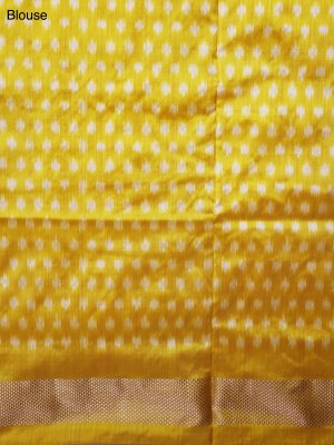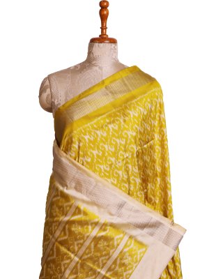 Mustard Yellow Ikat Silk Saree with Red & Purple Dual Border