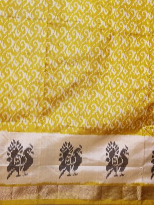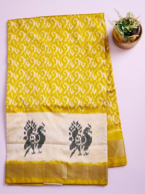 This lime yellow and off-white ikat silk saree offers a sophisticated play on color, blending zesty citrus tones with a soft, neutral base. The design is beautifully elevated by an intricate grey peacock motif and a solid zari border, ensuring a perfect blend of heritage and modern charm. Crafted for grand and meaningful celebrations, it celebrates understated elegance and timeless symmetry in every fold.