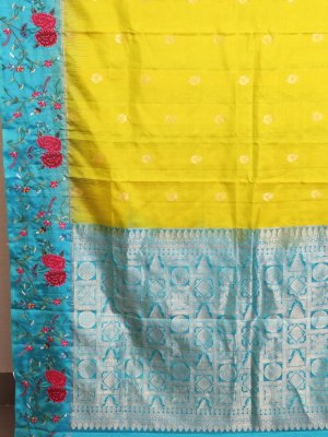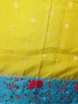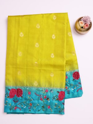 A lime-green soft silk saree adorned with a finely detailed cross-stitch embroidered border. The floral pattern blooms in elegant shades of red, rose, green, white, and maroon, creating a rich and striking contrast. Its smooth silk texture offers a graceful drape with a subtle natural sheen. A perfect blend of vibrance and tradition, ideal for festive and special occasions.
