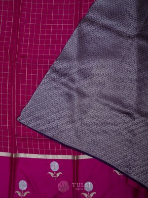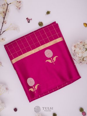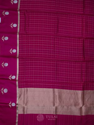 Magenta Pink Banarasi Silk Saree adorned with intricate zari checks throughout and a border featuring large, detailed buttas, combining vibrant color with sophisticated design.