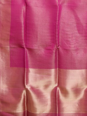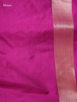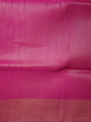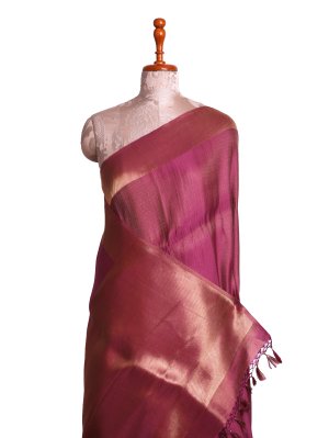 This Magenta Pink Mashru silk saree exhibits a vibrant chevron textured body crafted with luminous metallic threads for a bold, radiant impact. The expansive zari framing leads to a weighted pallu adorned with handcrafted knotted fringes, lending a majestic and structured feel to the drape. A tonal self-colored blouse maintains a sleek, unified color story, perfect for making a grand statement at cultural gatherings.