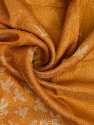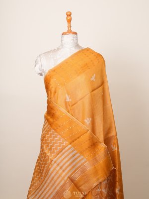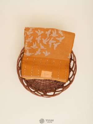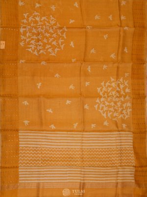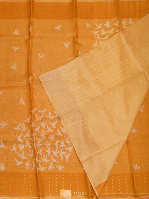 This Mango Yellow organza silk saree, features delicate bird design on the body & sequences on the border for an added touch of glamour. A perfect blend of traditional artistry and modern elegance, ideal for festive occasions.