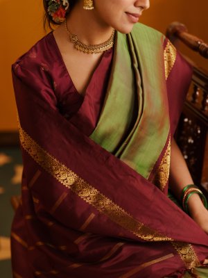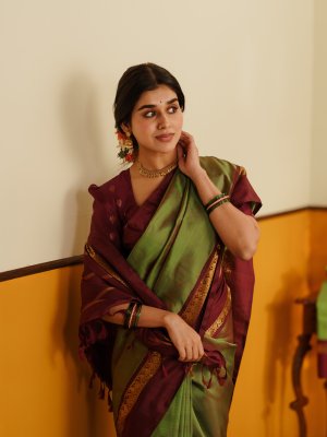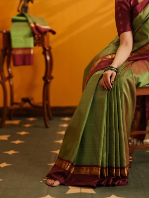 This Manthulir Green Kanjeevaram Silk Saree, featuring a rich brown border and pallu adorned with intricate golden zari work. The serene green body exudes elegance, while the deep brown tones add a touch of warmth and grandeur. Crafted from luxurious silk, this saree drapes beautifully and captures the charm of vintage Kanjeevaram artistry.