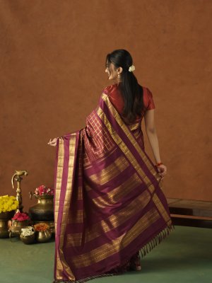 Maroon Checked Kanjeevaram Silk Saree With Maroon Border