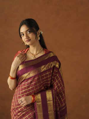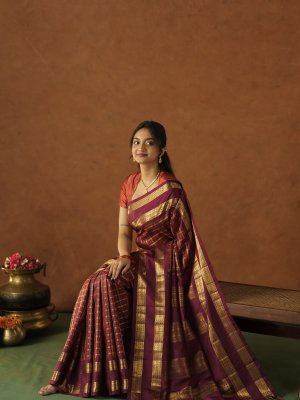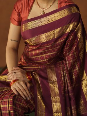 This Maroon Kanjeevaram silk saree is a masterpiece of traditional weaving, radiating a timeless and deep elegance. The saree's base is a rich, luxurious maroon (or deep wine) hue. The body features an intricate pattern of small, interwoven checks in warm orange and lustrous gold zari threads, giving the fabric a distinct, shimmering texture and a vibrant depth that catches the light beautifully with every movement.