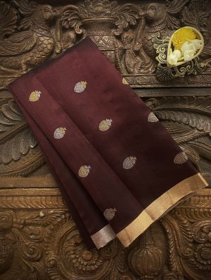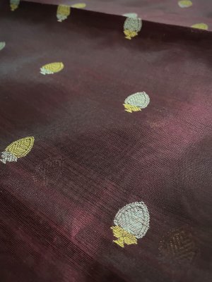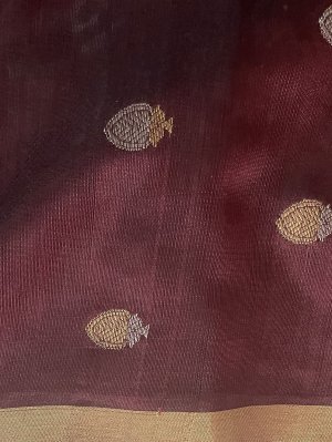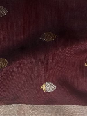 This Handwoven Maroon Chanderi Silk Blouse is embellished with gold and silver zari detailing accompanied by gold and silver borders.