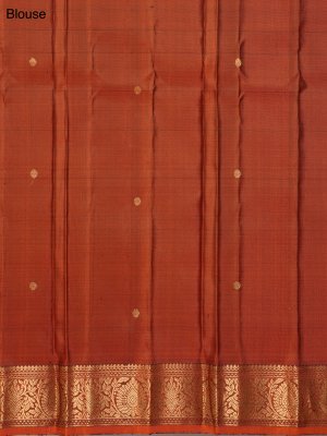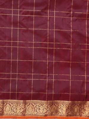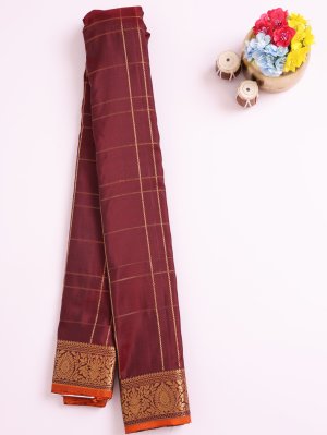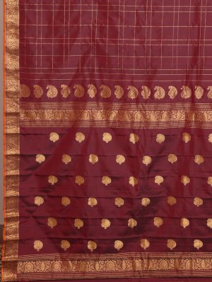 This dark maroon Gadwal silk saree features a deep maroon base beautifully contrasted with a vibrant orange selvedge. The body showcases an intricate zari check weave, adding depth and classic elegance. It is framed with a delicate floral border in shimmering zari, enhancing its timeless and regal appeal.