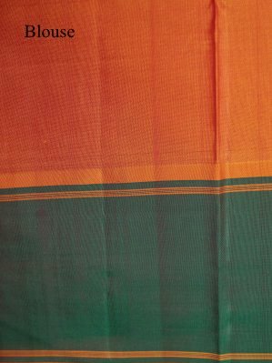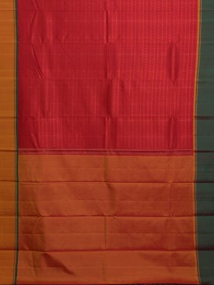 This maroon Kanjeevaram silk saree is rich and elegant with a beautiful traditional look.It features a classic Ganga Jamuna border with contrasting green and mustard tones.The soft silk fabric has a natural shine that adds to its festive appeal.The maroon pallu comes with subtle woven patterns for a refined finish.Perfect for weddings and special occasions, giving a graceful and royal feel.