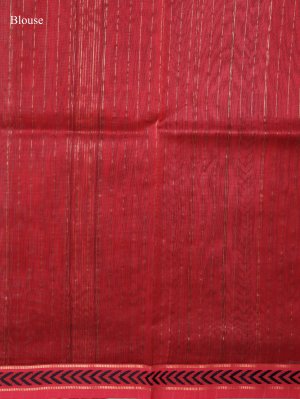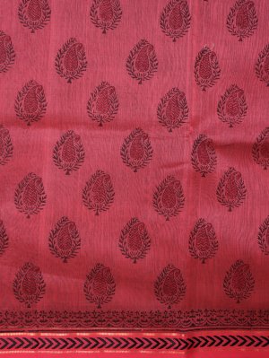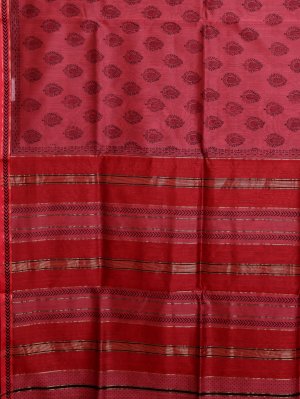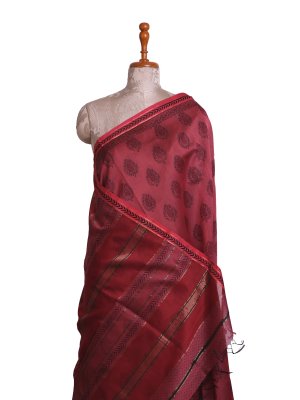 This Dusty Dark Pink Maheshwari Cotton Saree features a lightweight body adorned with intricate black block-printed paisley motifs that offer a delicate textural contrast. The structural detail of the border is defined by multiple horizontal bands of shimmering gold zari and geometric patterns in black, providing a refined frame to the drape. The finishing of the pallu includes elegant striped zari work and traditional knotted tassels, making it a perfect choice for breathable and stylish formal wear.