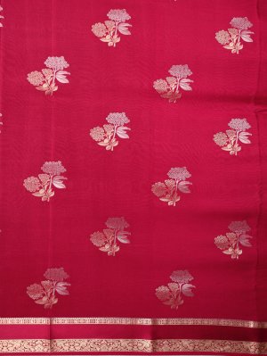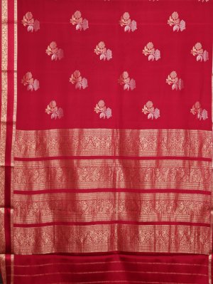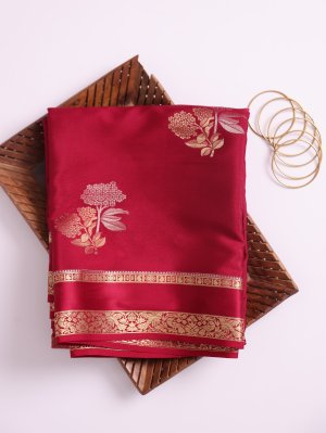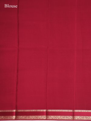 This stunning Mysore Silk saree in a regal maroon tone is beautifully adorned with shimmering gold and silver zari floral motifs across the body. The border is intricately woven with classic zari and pattupettu patterns such as kuyil kan, manga, kamalam, parrot, and pillaiyar temple designs. Its soft, lustrous silk texture offers an elegant and flattering drape. The richly crafted pallu features traditional zari artistry, completing the look with timeless grace.
