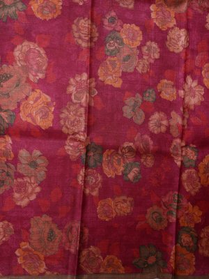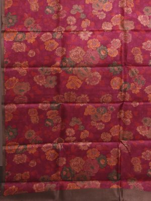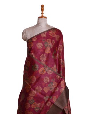 This Maroon Tussar Silk saree features a naturally textured body enriched with a dense arrangement of multi-colored floral digital prints that create a lush visual depth. The design is grounded by a solid brown border that offers structural definition and a sharp contrast to the warm tones of the fabric. A pallu provides a clean and polished finishing touch of brown, ensuring the drape remains graceful and well-defined for any formal setting.