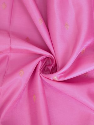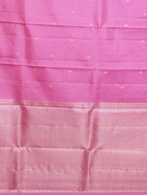 This Lotus Pink Kanjeevaram Silk Dupatta features delicate gold zari floral buttas across a lustrous handwoven field. The ornate traditional border showcases intricate geometric patterns and dense zari craftsmanship, finishing in elegant hand-knotted tassels for a timeless, regal wedding aesthetic.