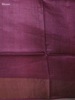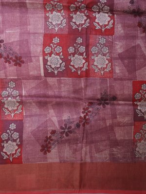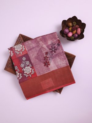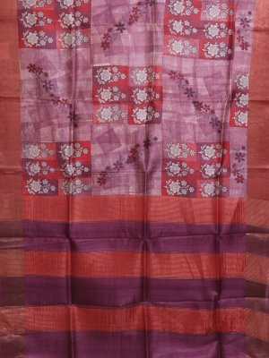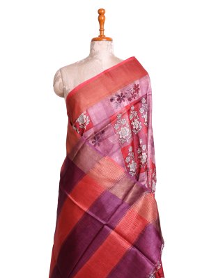 This Mauve Tussar Silk saree showcases a textured, earthy body adorned with intricate floral blocks and diagonal vine patterns. The fabric presents a substantial yet breathable feel, framed by a structured border of alternating deep berry and burnt orange bands. A striking pallu completes the drape with horizontal metallic gold thread stripes and bold geometric color blocks for a refined, modern finish.